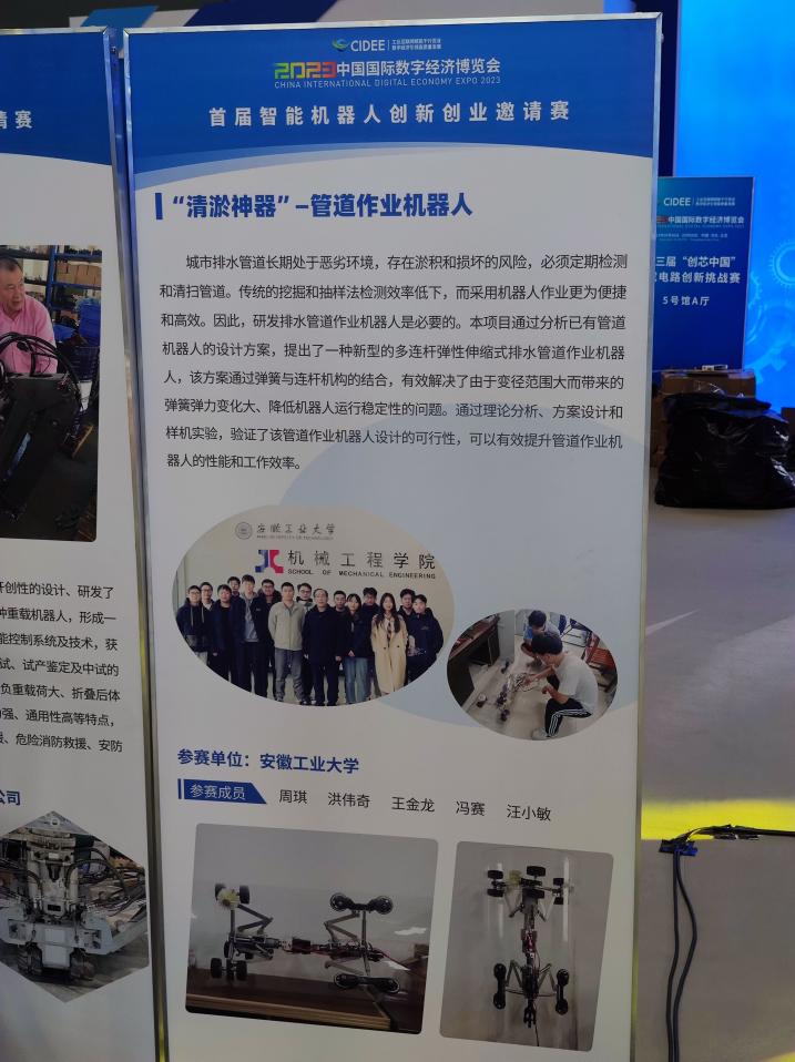 硕士研究生周琪及其团队的参赛作品(“清淤神器”——管道作业机器人,指导教师:汪永明教授),于8月底通过邀请赛的初审、复审环节顺利进入决赛,并在9月6—7日的石家庄市国际会展中心现场决赛中脱颖而出,荣获服务机器人赛道全国二等奖。