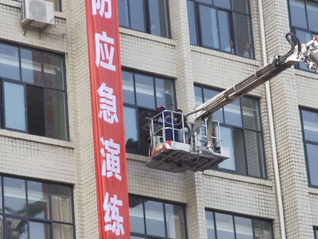 此次应急演练分消防演练与反恐演习2部分。消防演练中假设高层发生火灾,学生用毛巾捂着口鼻,依次有序跑步离开大楼,消防救援人员通过高压水枪扑灭火源,通过云梯解救高层被困人员。反恐演习假设的背景是因为网络贷款,对方前来要挟,拿砍刀威胁,突发状况后,保安、民警、特警依次出来,武力制服了危险分子。整个演练过程,同学们精神高度集中,认真听从指挥。