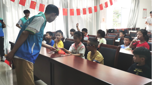 本科生第四党支部书记濮莹萍向在场的教师、社区工作人员和幼儿园小朋友们介绍了支部成员和此次宣讲的主题及目的。接着,学生党员郑雪城同学以通俗易懂且生动活泼的语言讲解极端天气的类型和预防措施,主要包括高温天气、雷电天气和台风天气等。他告诫小朋友们在高温天气时,不要私自下河洗澡,不要暴晒以防中暑;在雷电天气时,不要外出,不要站在顶端尖锐的建筑物旁边,防止被雷电击中;在台风天气时,要关紧家里的门窗防雨,搬移窗台或阳台上的物品以防砸落。活动过程中设置了有奖问答环节,实践队员们细心准备了很多小朋友们喜爱的礼物,其中包括了五星小红旗、剪纸、小扇子和小玩具,小朋友们纷纷举手发言,通过回答问题的方式来获取小礼物。