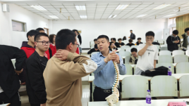 讲座围绕青少年健康,向大家普及视力保护、皮肤痤疮、脊椎疾病等相关知识。门诊部主任吴刚针对新生就医困惑进行梳理,着重介绍医院门诊科室分布和就医优惠政策。眼科视光中心主任王清华对视力保护和常见诊疗手段进行介绍。脊柱外科主任褚培林以“脊椎疾病的认知与日常防护”为主题,结合临床案例,详细讲解脊椎病的成因、症状及防治措施。他强调,长期伏案工作、不良坐姿是导致脊椎问题的主要诱因,并现场示范了科学坐姿和简易保健操,呼吁师生“早预防、早发现、早干预”。