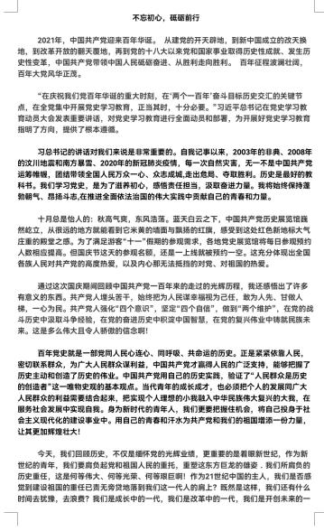 于10月中上旬在线上举办了“百年华诞悟党史,喜迎国庆表初心”活动。学生自主选择参赛形式,可以通过DIY徽章,征文或短视频的形式,在国庆节里感悟党史,体悟“是他们给了我们现在的生活”。