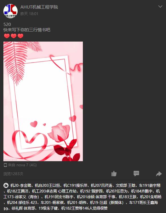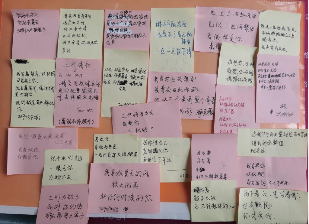 前期通过官Q、QQ群等渠道推送活动通知,鼓励同学们广泛参与,手写、打印、电子版提交作品均可。最终8位同学的作品脱颖而出,被评为最佳“三行情书”。