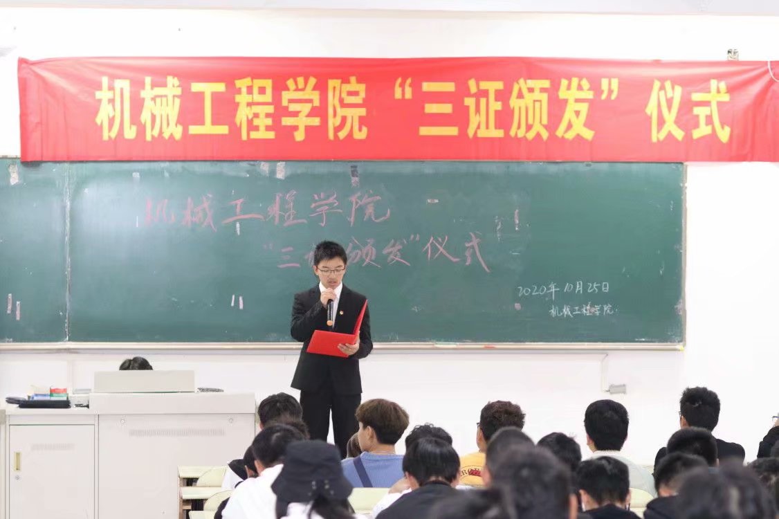 为增强新生团员意识,广东麻将番数 于10月25日中午在教三南103教室举行了2020级新生团员“三证颁发”仪式暨2019—2020学年院优秀“五四红旗团支部”颁奖典礼。出席此次活动的有院团委书记费白露、院团委副书记薛宇、院学生会主席吴超旭及2020级全体新生团员。仪式由院组织部干事黄柳钦主持。