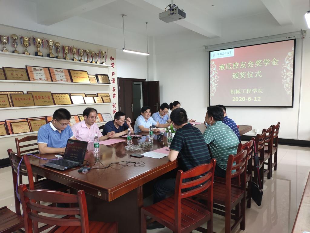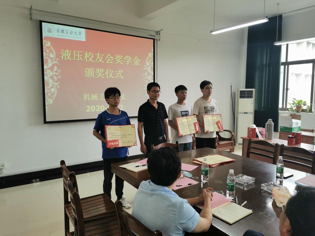 2020年液压校友会奖学金颁发仪式在机械楼302会议室举行。党委书记徐柳根、副院长李克明、副院长汪永明、院机自党支部书记王刚、院团委副书记费白露、校友代表朱钱有明、戴本俊、叶兴海等出席颁奖仪式,仪式由2016级机械设计制造及其自动化专业液压方向本科生辅导员董春辉主持。