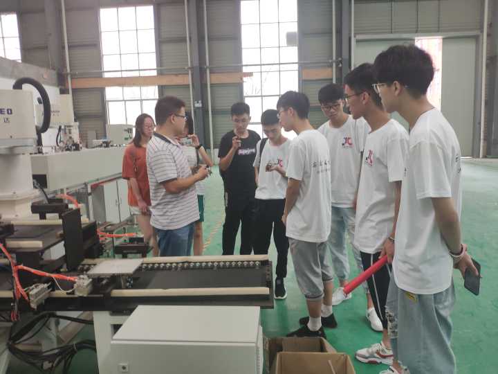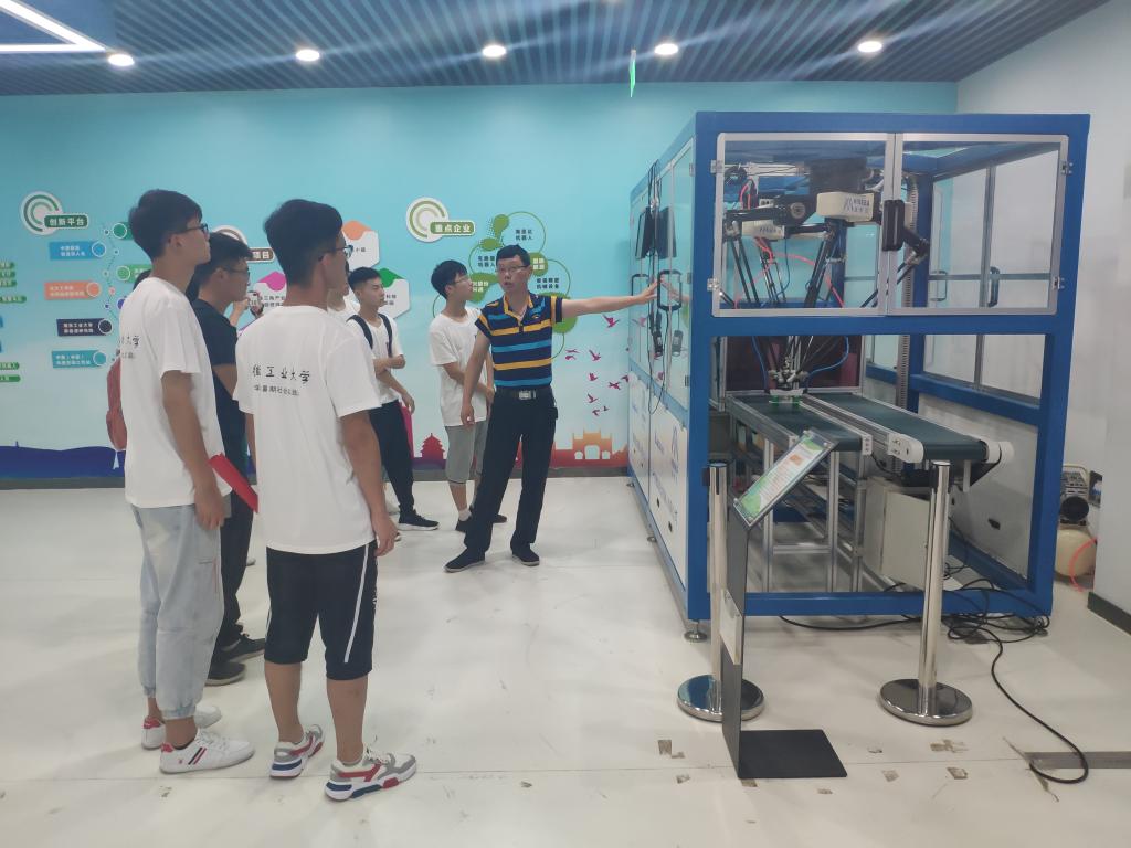 首先,海思达公司副总王总为两个实践团队首先进行了对公司历程、荣誉以及产品的PPT演示,并且给实践队讲解了现科技机器人分轴的机械结构。接着王总带领实践队到海思达机器人展览室进行参观。王总亲自一边操作双履带三轴机器人,一边对实践队队员进行讲解。王总表示:次设备基于机械视觉进行捡炼物体,工作效率快。还表示公司现阶段,做流程设备最基本就是靠机械视觉进行完整的流程设备设计。随后,实践队队员们纷纷向王总请教了心中的疑惑之处。最后,大家一起到车间参观了机器的操作流程。