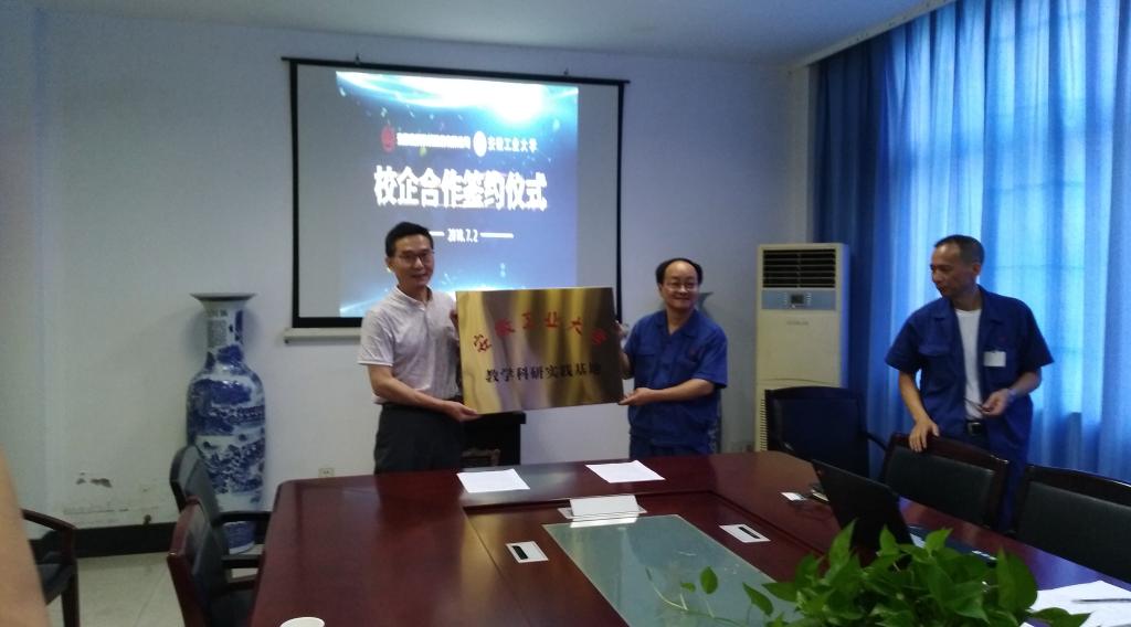 在安徽安簧机械股份有限公司举行教学科研实践基地签字和挂牌仪式。院领导一行出席授牌仪式并讲话。安徽安簧机械股份有限公司副总经理黄昌文、方军等领导出席了签字和挂牌仪式。