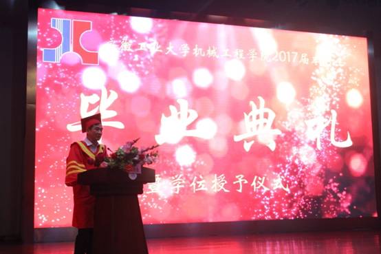 向圆满完成学业的毕业生表示祝贺,并提出了殷切希望:一是要有追求理想的情怀。积极响应国家“大众创新,万众创业”的号召,努力守护自己的理想,充分激发内心的正能量,以乐观向上的信念、百折不挠的精神面对一切。二要有追求卓越的坚持。始终坚持和弘扬“精工博学、厚德敏行”校训精神,自觉做安工大精神的传承者、践行者和守护者,勇于探索,敢于创新,自强不息,追求卓越。三要有对社会的责任和爱。怀揣一份对社会的爱和责任,既志存高远,又脚踏实地;既顺应潮流,又勇于担当,将个人的梦想融入民族复兴的中国梦,在中国特色社会主义伟大实践中焕发青春的光彩。