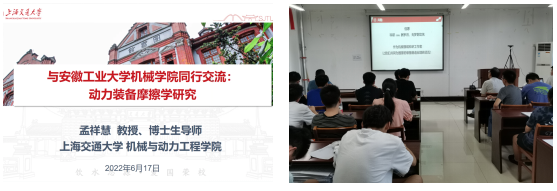 孟祥慧教授从车用、船用发动机的现代摩擦学设计理念出发,引出摩擦动力学设计理论的耦合构建过程,着重介绍了相关理论在发动机关键部件设计与分析中的重大工程应用。针对动力装备系统的正向摩擦学设计需求,孟教授介绍了团队在多尺度先进润滑理论和摩擦学在线测量技术方面的最新研究进展。最后,孟教授回顾了自己的科研经历和基金申报过程,毫无保留的分享了如何从横向研究中提炼科学问题的心得,并用诗句“科研酬岁月,无梦到功名”,勉励大家找好自身定位、树立科研目标,面对挫折和捷径保持足够定力,为国家装备制造业发展增砖加瓦。报告结束后,孟教授和与会师生积极互动、共同探讨,对广大师生提出的问题进行了详细解读。报告开拓了与会师生的视野,激发了师生科研热情,赢得了多次热烈掌声。