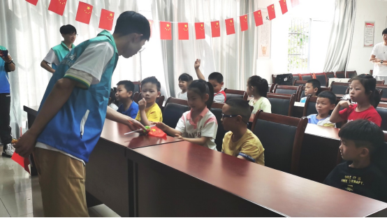 图为实践队员在为小朋友颁发小奖励。