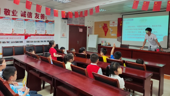 “共建生态文明,贡献青春力量”实践队赴花和佳苑社区党群服务中心开展了科普宣讲活动,向花和幼儿园的小朋友们宣传气象科普知识,增强孩子们的安全意识。高温、暴雨、雷电天气中,如何保护自己才能避免险情,主讲人运用动画视频,形象生动的向小朋友们介绍了各类气象知识。互动环节中,孩子们积极回答实践队员提出的问题,主动表达自己对相关气象知识的理解,场面十分融洽。