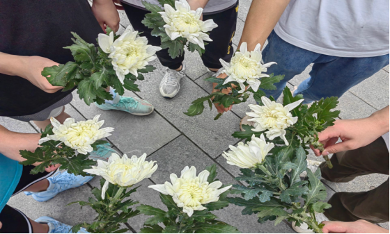 图为实践队员为遇难同胞准备菊花悼念,缅怀先烈,悼念难民