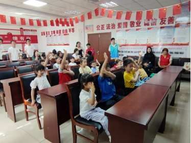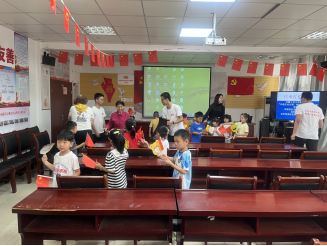 图为实践队员为小盆友们分发小红旗