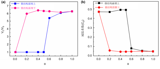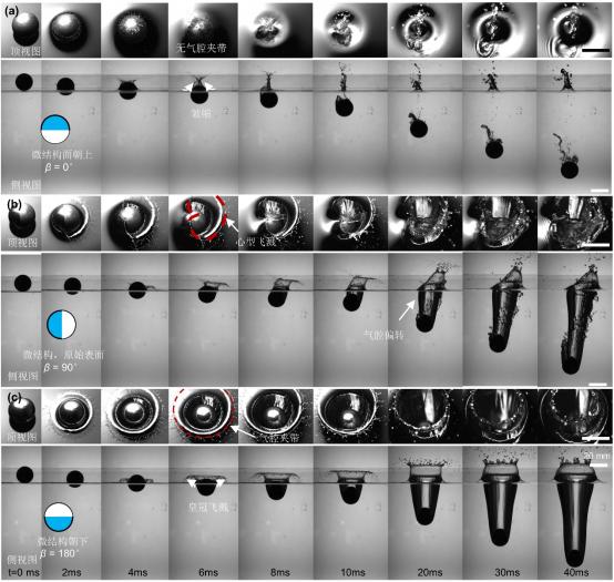此外,团队针对表面微观形貌对液膜飞溅的影响机制是固-液界面减阻气腔构筑机制中的关键科学问题,开展了考虑表面形貌效应的球体入水动力学特性研究,分析了微结构面积占有率不同的球体垂直入水多相流动过程,并从能量角度揭示了非对称入水气腔偏转机制。形成的入水气腔能够将表面无滑移边界条件转变成气液界面自由滑移边界条件,显著降低流体阻力。通过调控表面形貌产生的非对称入水气腔为跨介质航行器入水提供了一种新的策略。相关工作发表在《中国科学:物理学 力学 天文学》,广东麻将番数