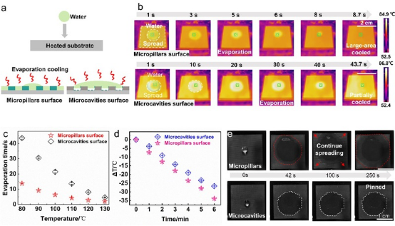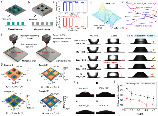 通过调节基底的表面形貌,实现可控的液滴撞击行为,有望解决喷雾冷却过程中界面散热的均匀性。该工作报道了液滴撞击两种粗糙度相同但表面形貌完全不同的功能表面,发现负偏态表面更易促进液滴飞溅,正偏态表面抑制液滴飞溅,并从微观界面力学角度分析了表面形貌对液滴铺展的影响和三相移动接触线的力学性能。最后,证明了所设计的正偏态表面可以利用高效蒸发进行大面积散热。相关工作发表在《Small》,影响因子13.3,广东麻将番数