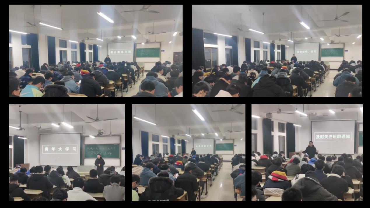 汪辉从防范电信诈骗、诚信备考、青年大学习、安全放假和返校、假期合理安排时间认真学习等方面展开。详细分析本学期机械学子遭遇电信诈骗的案例,再次强调学生要提高防诈意识和能力。举例分析教务处公布的期末考试违纪事实,警示学生要认真复习、诚信备考。强调全体学生每周都要坚持学习青年大学习,加强自身的政治理论学习。提醒学生放假和下学期开学相关注意事项,做好个人人身和财产安全防护。叮嘱学生合理安排寒假时间,挂科的同学要认真复习,准备下学期的补考。