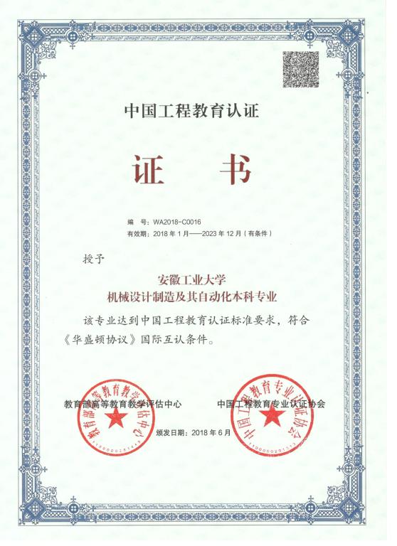 机自专业中国工程教育认证证书